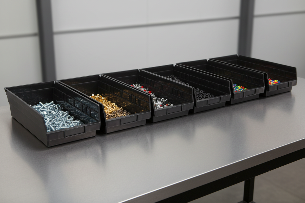 Made for 18” shelving, perfect for organizing small parts, home goods or warehouse picking bins. Nesting, with easy access - rear notch allows bins to slide and hang open (does not stack). Continuous construction without seams allows for years of heavy use. Made in the USA.