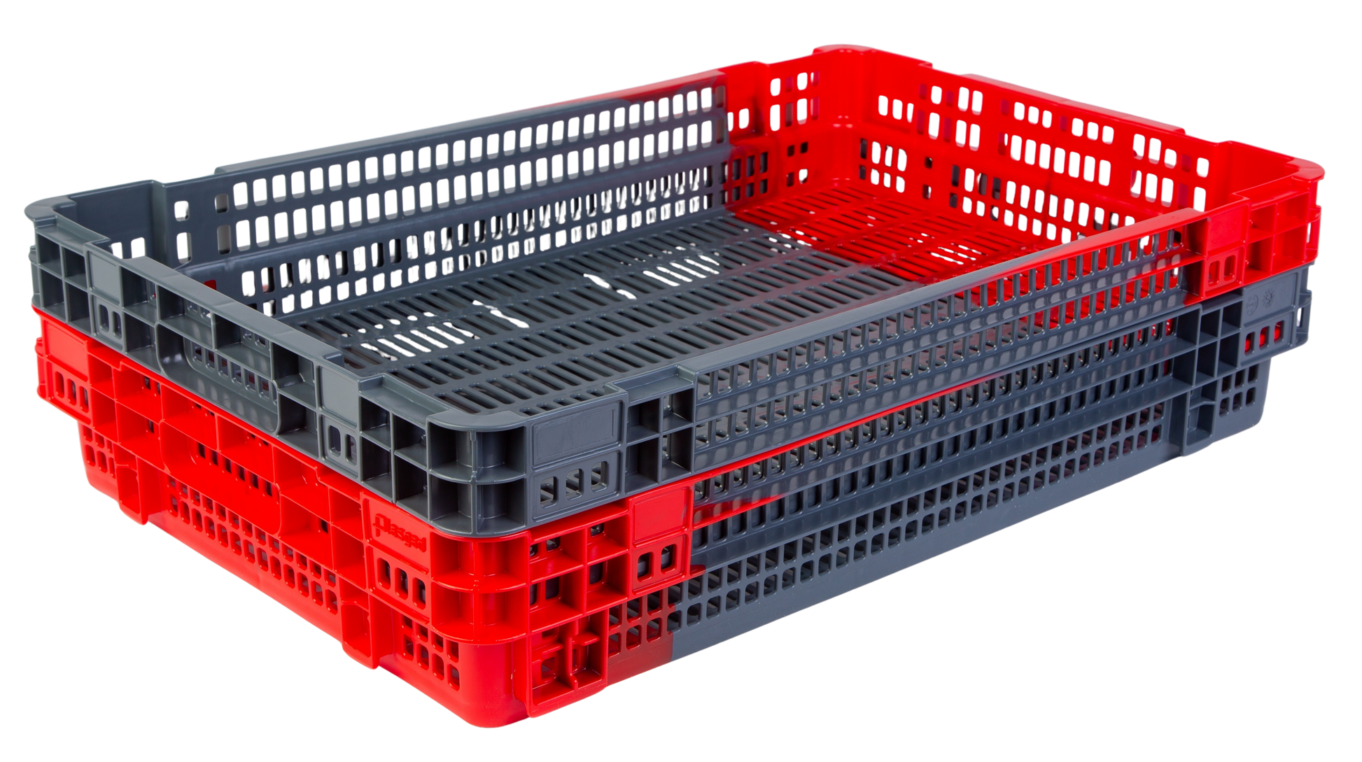 The Hudson Exchange 23.5 x 15.75 x 4" Agricultural Vented Crate offers versatile storage with stackable and 50% nestable design, distinguished by two colors for easy mode identification. Its vented structure ensures optimal airflow, making it ideal for freezing and other temperature-sensitive applications. Crafted for multipurpose use, this handled tote supports various industries requiring durable, efficient containment and transport.